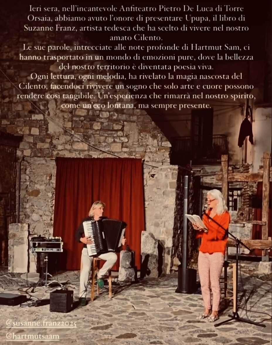 Montag, 21.Juli 25 Goethe Institut Freiburg / Italienisches Konsulat Freiburg, Donnerstag, 21. November 24 Atelier Susanne Allgaier, Freiburg, Lesung & PhotoProjektion - Sonntag, 23. Juni 24, Galerie Helmers, Lipburg, 45 Jahre Kunstschule & Galerie Helmers